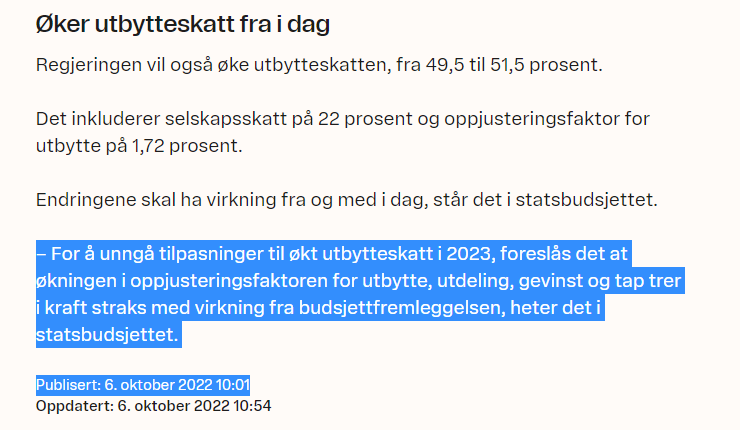 På ett år har renten økt med hele 225 prosentpoeng. I dag kommer fasiten. Statsbudsjettet for 2023 inneholder blant annet forslag om økt utbytteskatt med umiddelbar virkning formuesskatt trinnskatt og arbeidsgiveravgift kakseskatt for arbeidsgivere med.